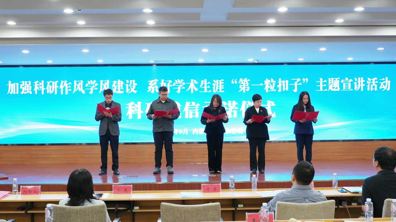 活動現場,內蒙古大學聯合內蒙古科學技術研究院、自治區人民醫院、內蒙古免疫學會發布了科研誠信倡議書,向全區科研工作者發出恪守學術誠信、弘揚優良學風的號召,并組織青年科研人員和研究生代表與自治區農牧業科學院、自治區第四醫院、內蒙古生物工程學會青年科研人員代表共同作出科研誠信承諾,用堅定的誓言表達了堅守學術初心、共同構建良好科研生態的決心。