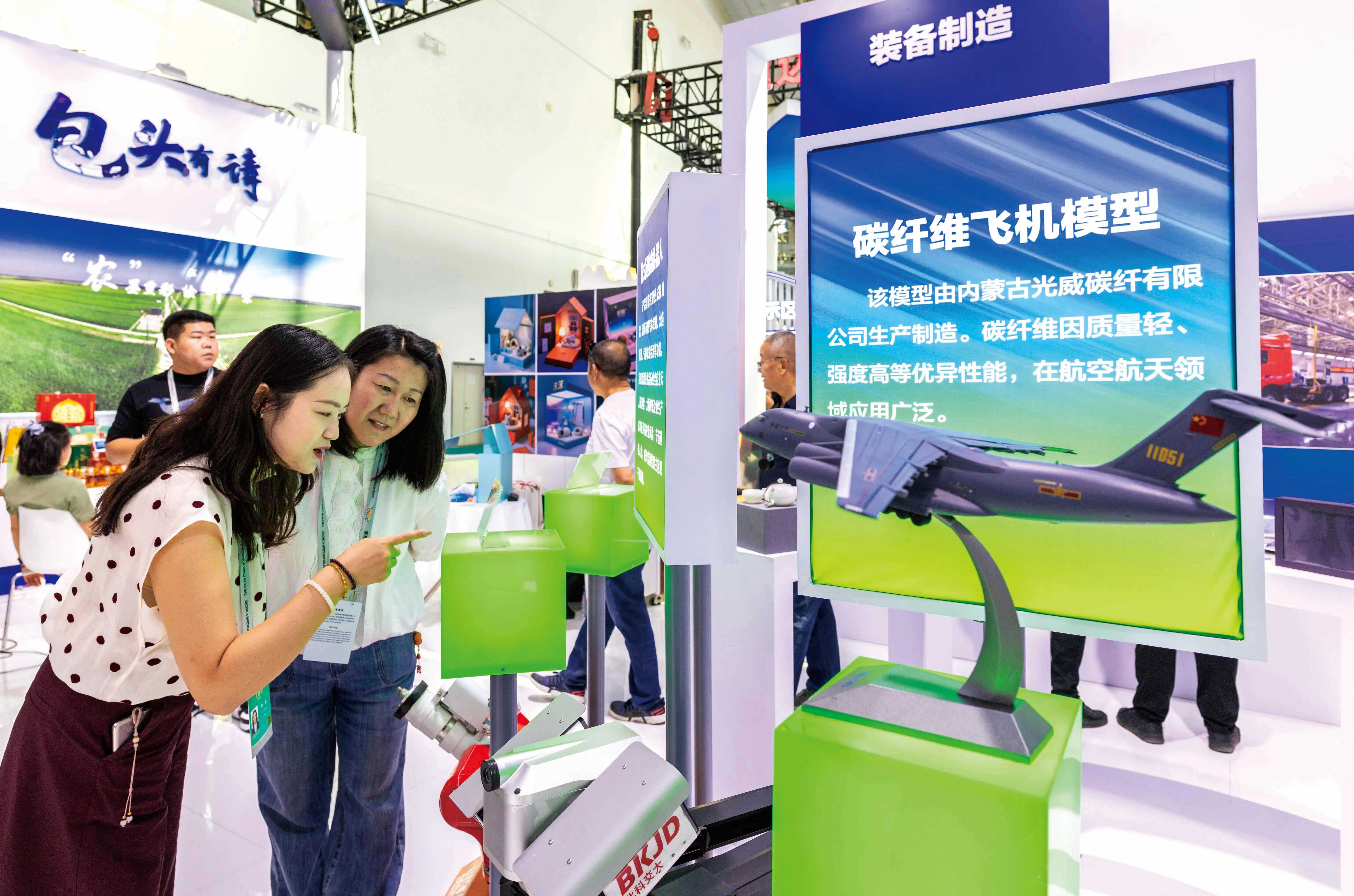 第五屆中國—蒙古國博覽會在呼和浩特舉辦,參觀者在包頭館了解碳纖維飛機模型。