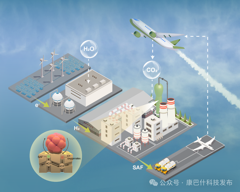 其中,實驗室在綠色航煤技術的研究成果突破尤為引人注目。針對航空航運碳減排難題,實驗室聯合清華團隊提出“生物質加氫”與“二氧化碳直接利用”雙路徑方案:該技術憑借碳氫最佳匹配、流程短的優勢備受全球關注。其路線在捕集二氧化碳的同時,可一步將其高效轉化為含80%以上可持續航空燃料的產品,更加符合我國的碳中和路線。該技術所用二氧化碳原料主要來自工業廢氣或空氣捕獲,供給幾乎無上限;而我國風電、光伏裝機量、發電量高居全球第一,通過成熟的電解水工藝即可制取足夠綠氫,有效解決了傳統工藝中原料依賴性強、能耗高的問題。目前,實驗室正與中國民航合作推進技術落地,力爭形成全球碳減排“中國方案”。